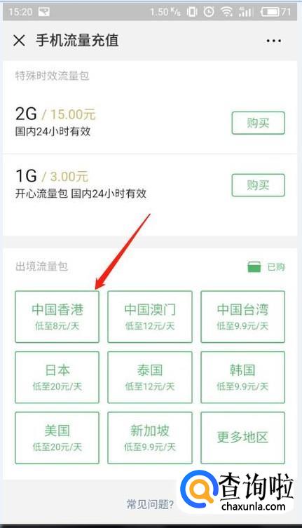 进入更多流量包后,我们下拉到底部会看到有境外流量包地区,我们选择需要购买的地区。