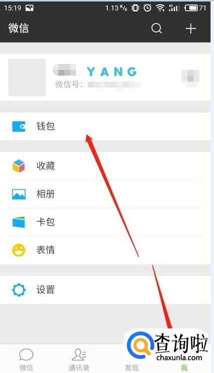 首先我们在手机里找到微信图标,点击图标运行。进入微信界面后,我们点击右下角的“我”,然后点击“钱包”进入。