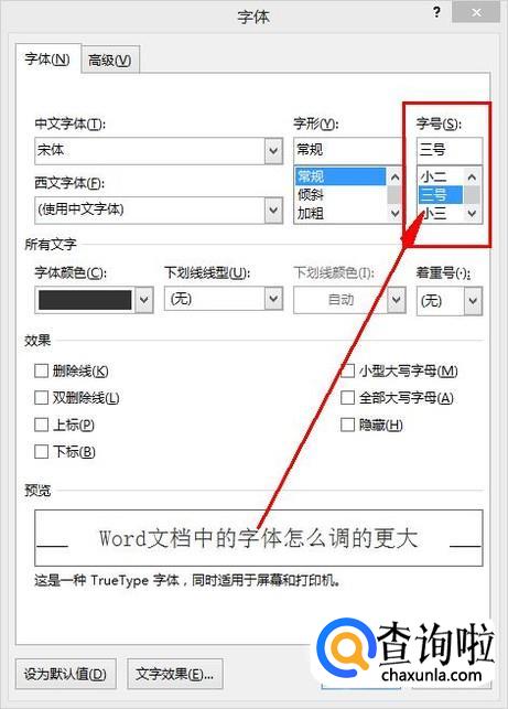 方法一:选中这些字,按照如图所示操作步骤,可以调整为任意大小。本例调整为“宋体三号”。