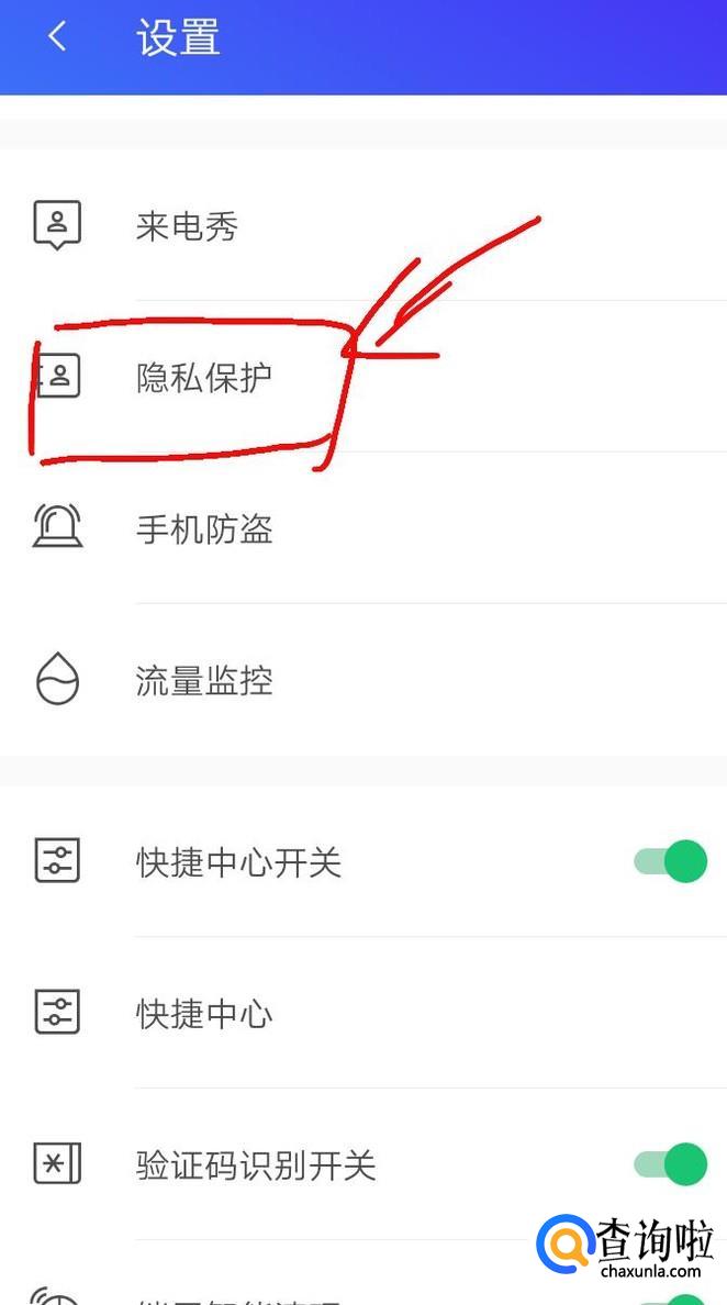 找到“隐私保护”,打开“隐私保护”,设置密码