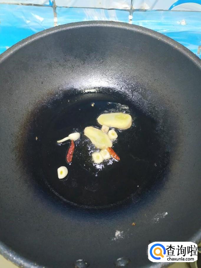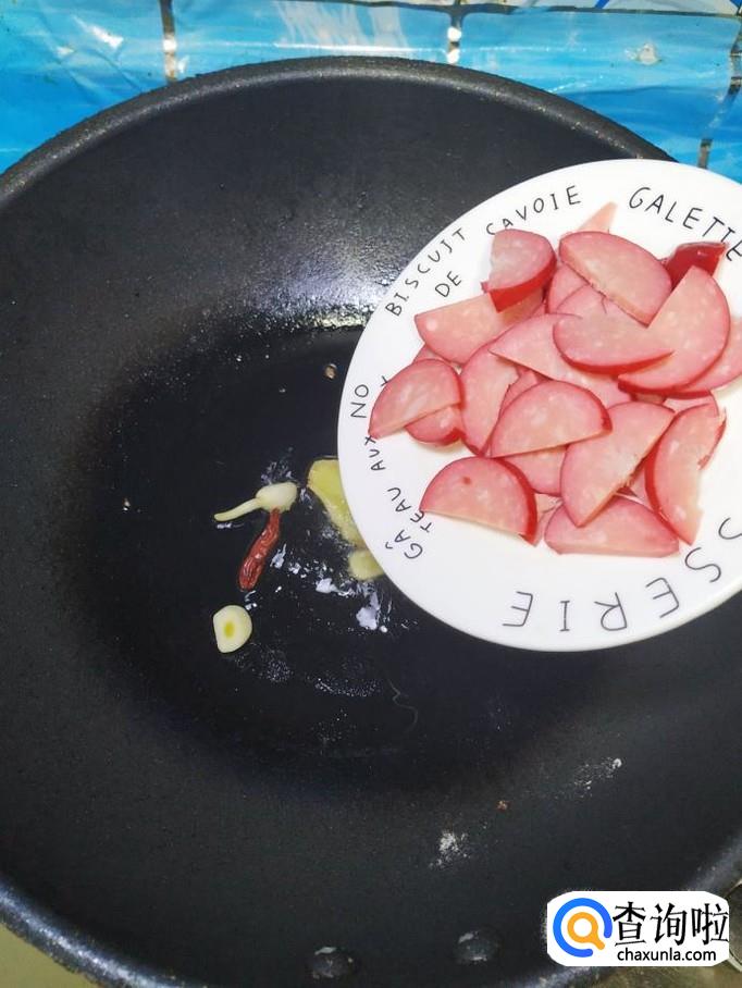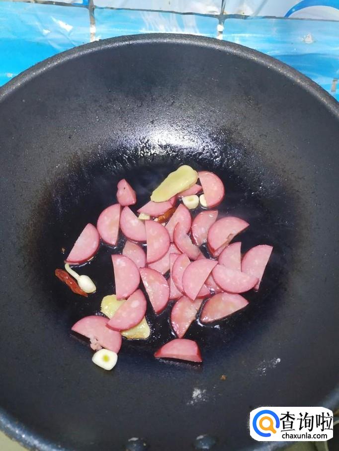 炒锅中放入适量油,油热后,放入姜片,蒜片,干辣椒炒香,然后将香肠放入锅中翻炒均匀。