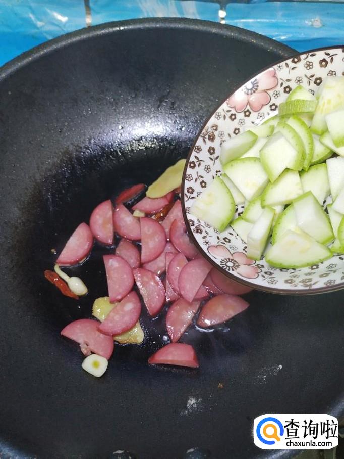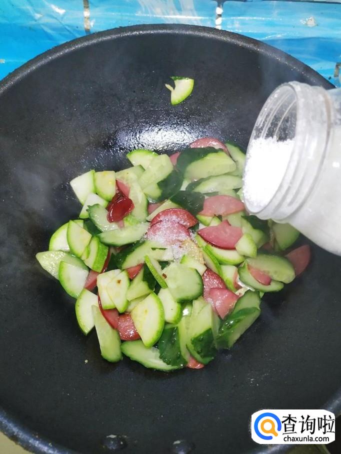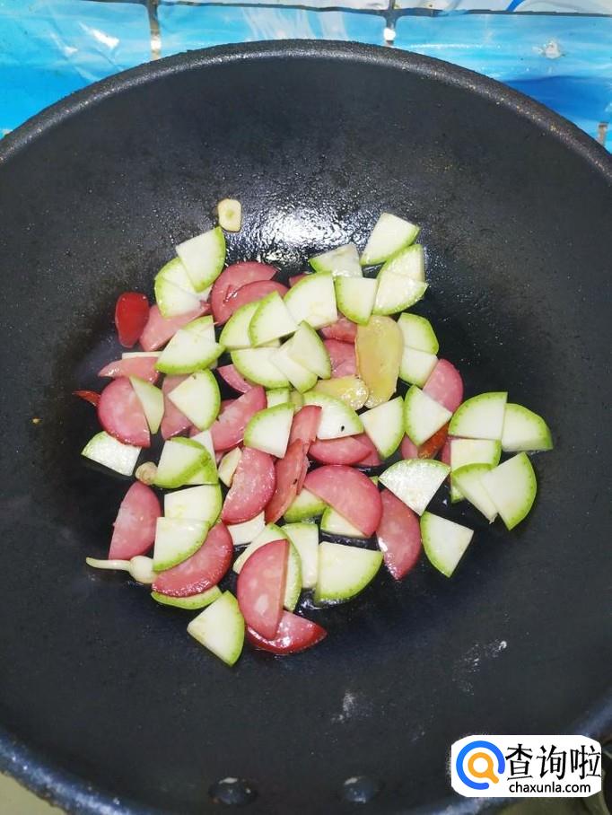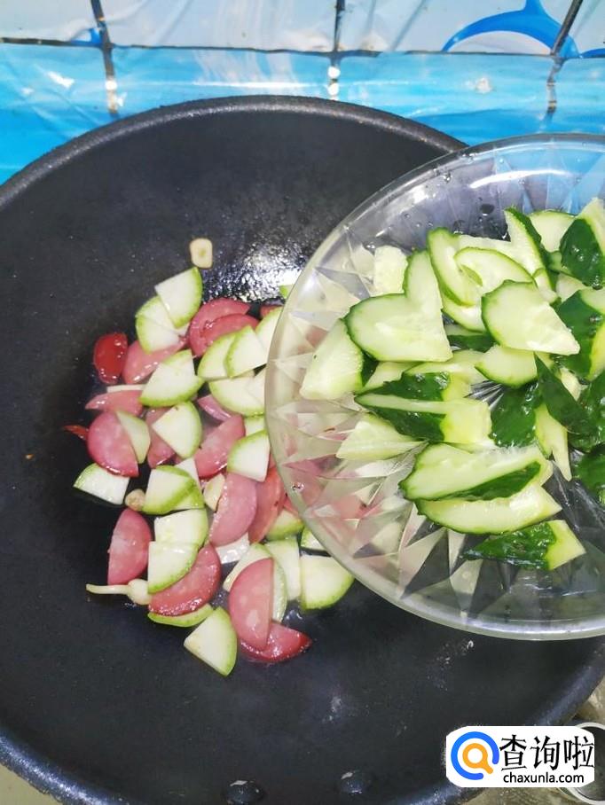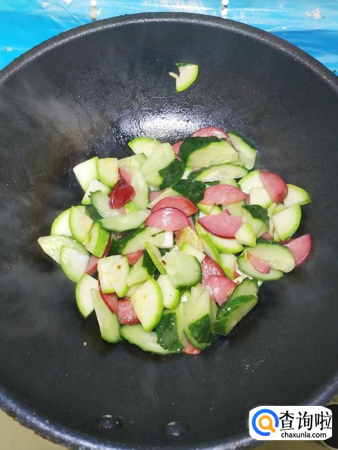 将准备好的西葫芦片,放入锅中,和香肠片一起翻炒均匀。