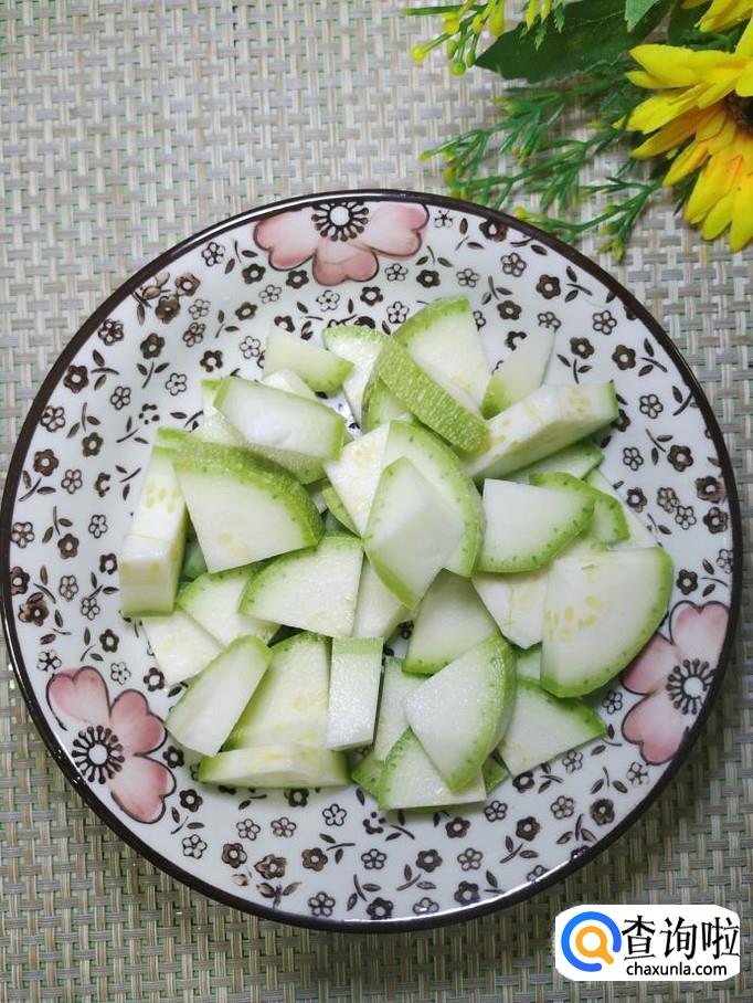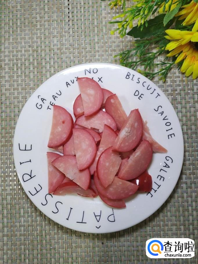 准备适量黄瓜洗净切成滚刀块,放入盘中备用;准备适量西葫芦,洗净后切成片,放入盘中备用;再准备适量香肠,切成片,放入盘中备用。