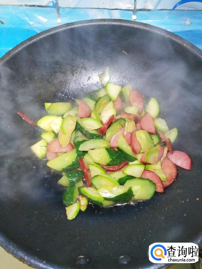 炒至西葫芦微微变软之后,将切好的黄瓜放入锅中,翻炒均匀。
