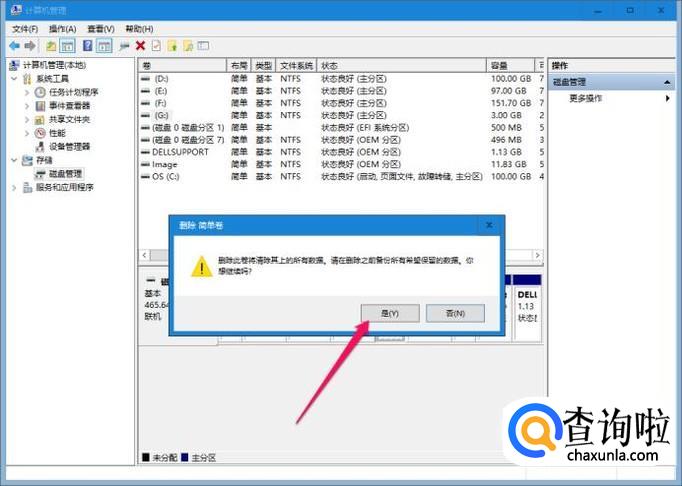 在这个弹出框,删除的简单卷中点击【是】,注意这一步电脑因为要计算所以运行比较慢,大家不要急,稍微等一会,如果这是后胡乱操作的话会对电脑有很大的损害。