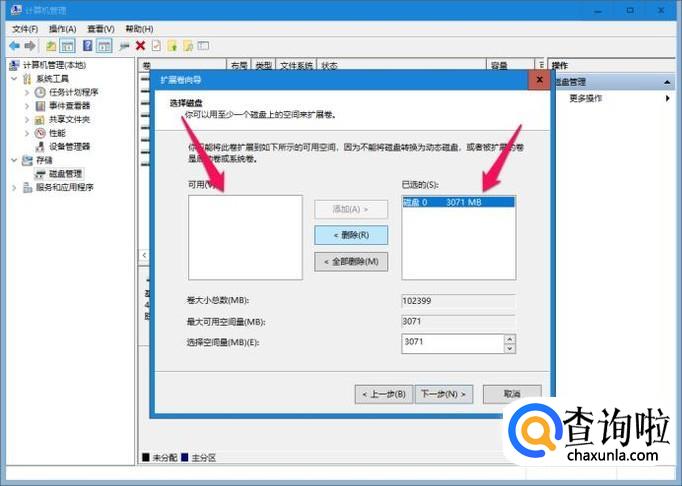 这个弹出框中左面【可用】表示你有几个未分配的空间量,【已选】表示你将要合并的未分配量,如果只有一个未分配量则前面的【可用】中没有,电脑会自动检测仅有的未分配量,直接放到【可用】栏里