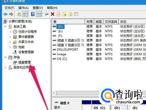 点击左下角的【磁盘管理】,这时会看到电脑中已经存在的几个盘,这篇指南以G盘合并到E盘为例。