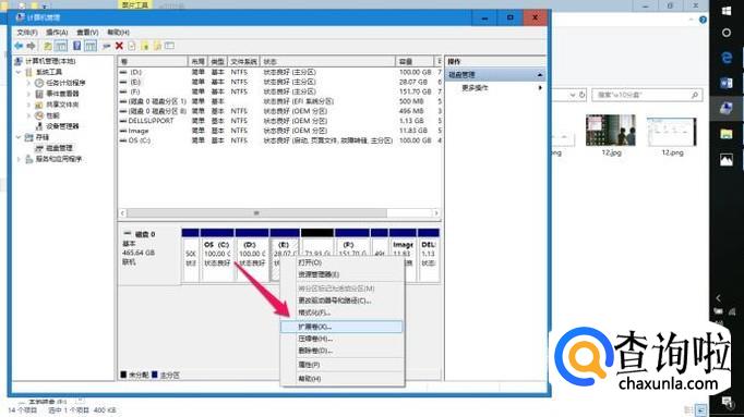 然后发现下面出现了一个未分配的空间量(颜色为黑色),此时你应该选择另外某个盘,注意一般不要选C盘,右击选择【扩展卷】,下面的操作就可以将未分配的空间量分给你后面选择的这个,例如E盘