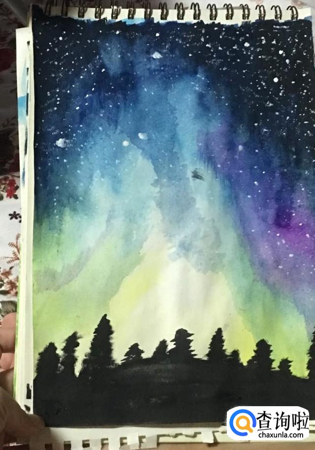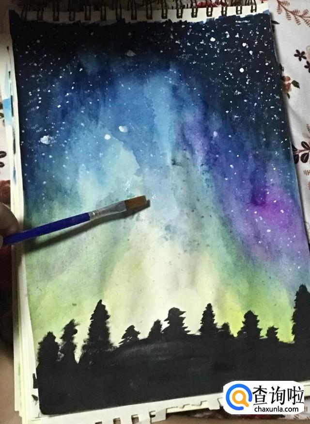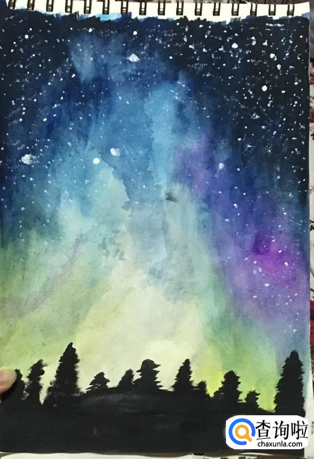 用白色颜料在天空中画出星空,注意星星有大有小,小的星星分布较密。