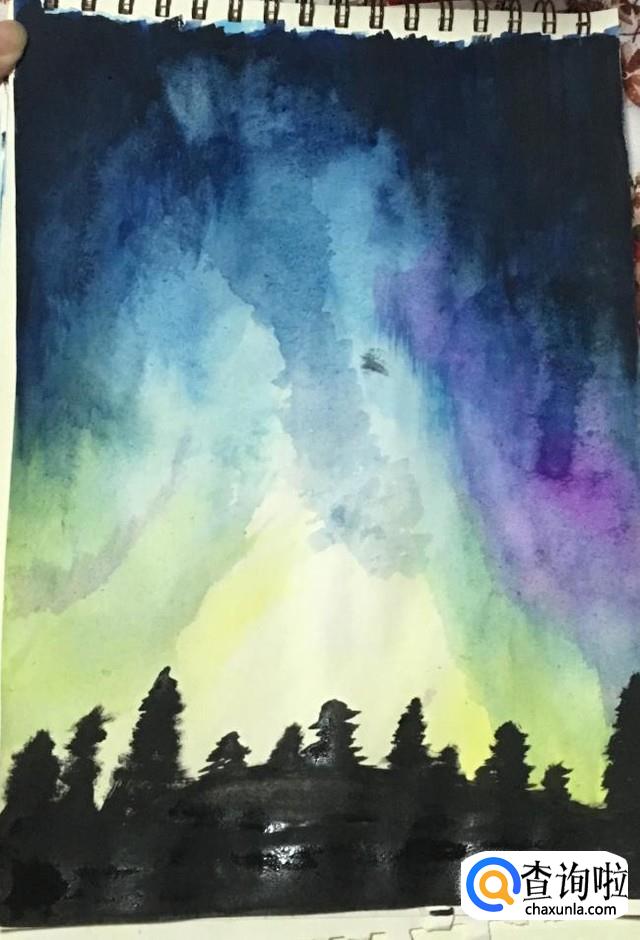 先晾五分钟,等纸干了用黑色在下方画出一片森林。