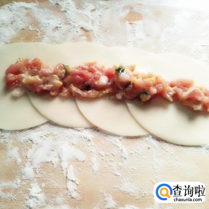 再用四张饺子皮来做一个稍稍大一点的,也是先铺好饺子皮,再在饺子皮上放饺子馅,再卷起来,用清水粘住。