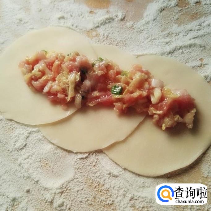 取出饺子皮,(有时间也可以自己做饺子皮,我买的成品。)先做一个小的玫瑰饺子,就是用三个饺子皮叠起来做一个大饺子,先铺好饺子皮,按相同距离摆饺子皮,然后把饺子馅放在中间,再翻过来,从一端开始卷,卷到最后就用清水粘住,这个饺子就做好了。