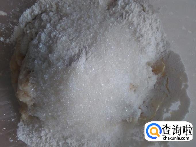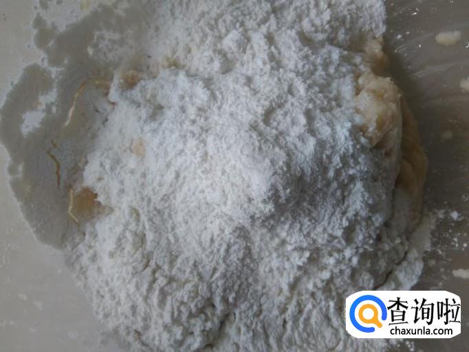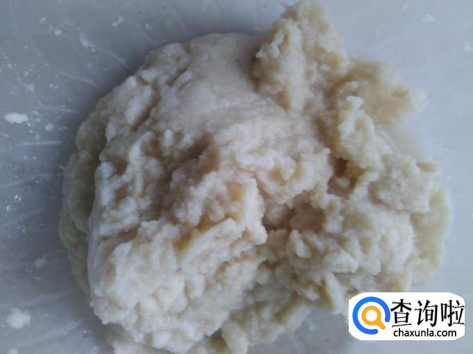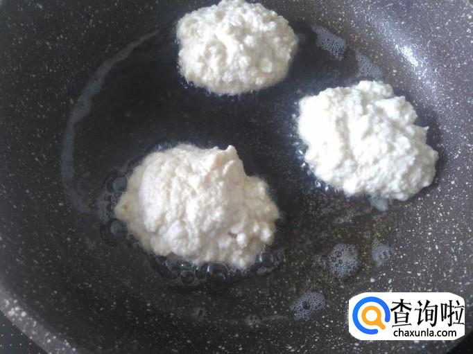 开火下油,因为糯米粉容易粘锅,所以油量要放多点,然后用勺子把适量的粉糊装到锅里,锅里的粉团要保持一点距离,因为糯米粉一碰上就会粘一起。