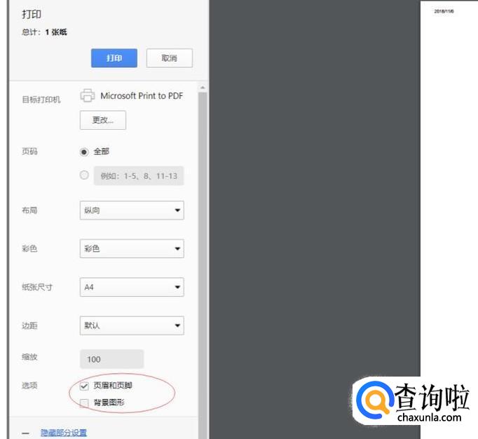 点击左边的更多设置,展开后,在页眉和页脚的选项前取消勾选