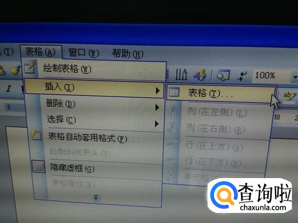 打开Word 2003后,自动打开新的空白文档,在顶端菜单栏,找到表格,点击它,在下拉菜单中选择插入,在右侧的选项中点击表格。