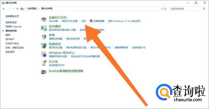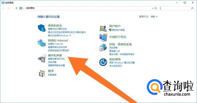 进入到“控制面板”后,再点击进入“硬件和声音”。