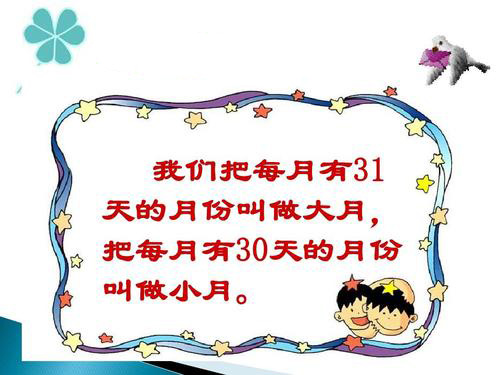 一年有7个大月和4个小月。公历的大月有31天,小月有30天。每年固定1月、3月、5月、7月、8月、10月、12月为大月;4月、6月、9月、11月为小月。2月既不是大月,也不是小月。2月平年有28天,闰年有29天。
