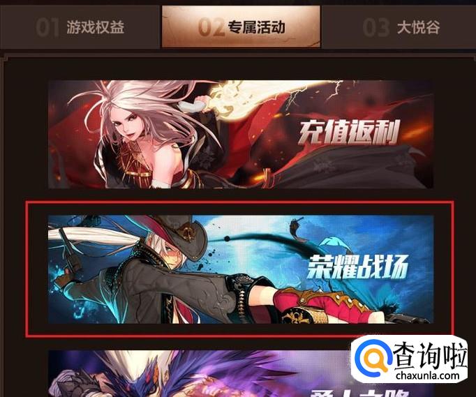 在专属活动一栏中,点击进入“荣耀战场”界面。