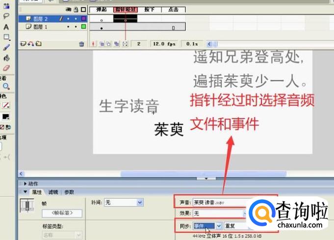 最后在属性面板中选择要配的声音文件,然后选择同步类型为事件,如下图所示