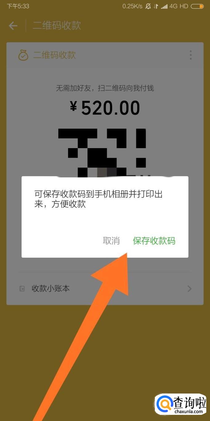 最后向付款方出示我们的二维码即可。如果付款人不在身边,还可以把二维码保存在手机相册里,发给付款方。