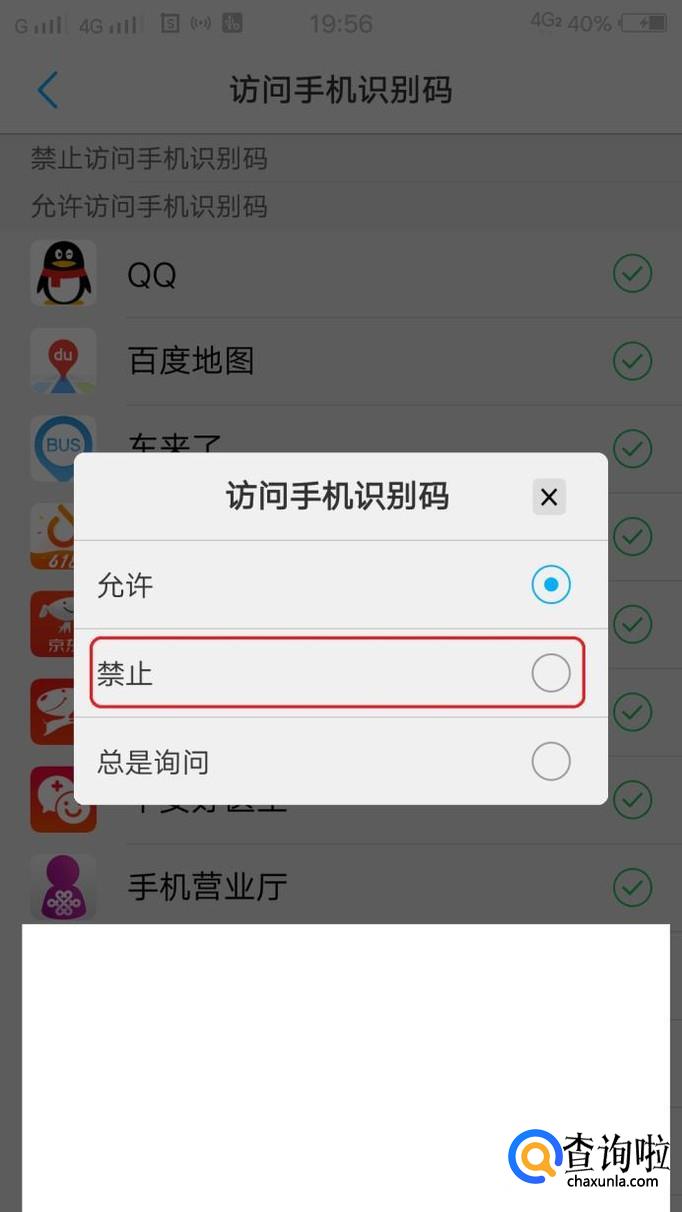 可以看到手机安装的外部应用,如果要禁止某个app访问手机的唯一识别码,直接点击该app右边的对勾,会弹出选择框,我们选择“禁止”就可以了。