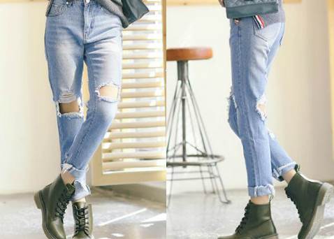 2、马丁靴+破洞牛仔裤