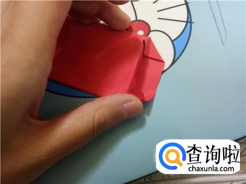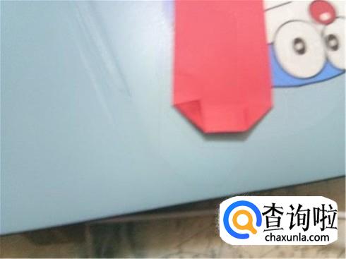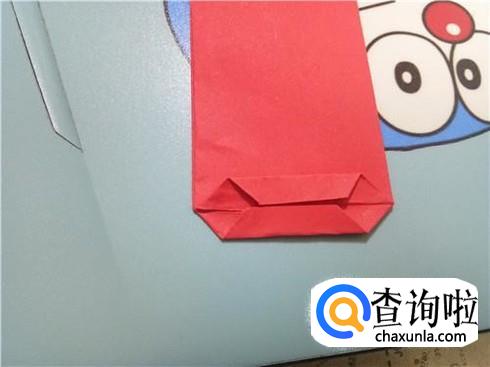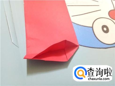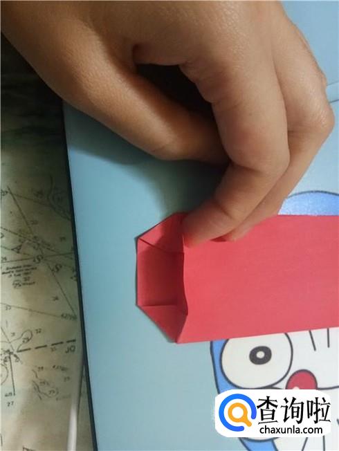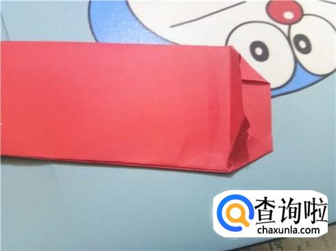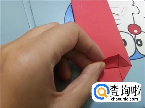 再沿着顺时针或者逆时针旋转90°,将下边的一条边向上折叠一小部分过后沿着刚才折叠出的线将两边折过去形成两个小的三角形。