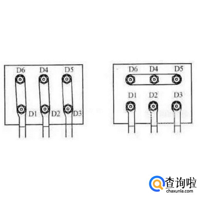 有些电动机接线柱标注为D1-D6,此时D1、D2、D3为一组,分别对应U1、V1、W1,而D4、D5、D6为另一组,分别对应U2、V2、W2。对应接法相同。