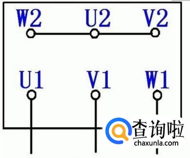 然后是三角形连接,此时将电动机的接线柱首尾相连,即U1接W2,U2接V1,V2接W1,最后接到电源即可,如下图所示: