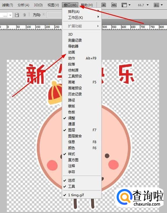 打开动态图片后我们点击顶部的“窗口”弹出菜单在“动画”选项处勾选。