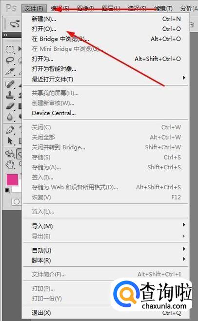 首先我们打开photoshop软件后点击“文件”会弹出菜单,我们选择“打开”选项。