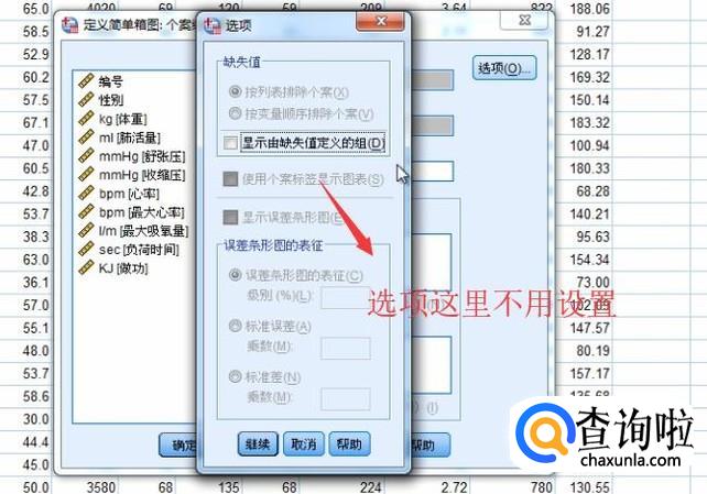 接下来点击选项按钮,在弹出的界面中去掉"显示由缺失值定义的组"复选框,如下图所示