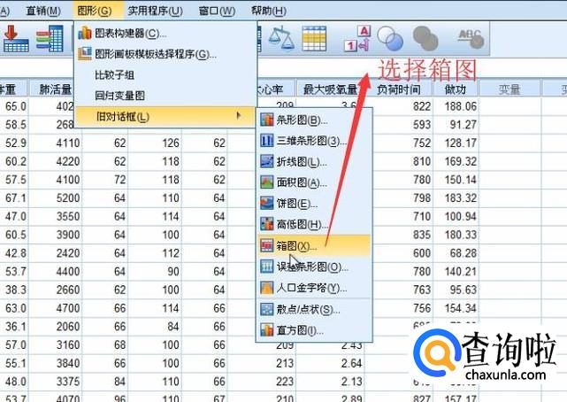 接着点击图形菜单,选择旧对话框下拉菜单中的箱图选项,如下图所示
