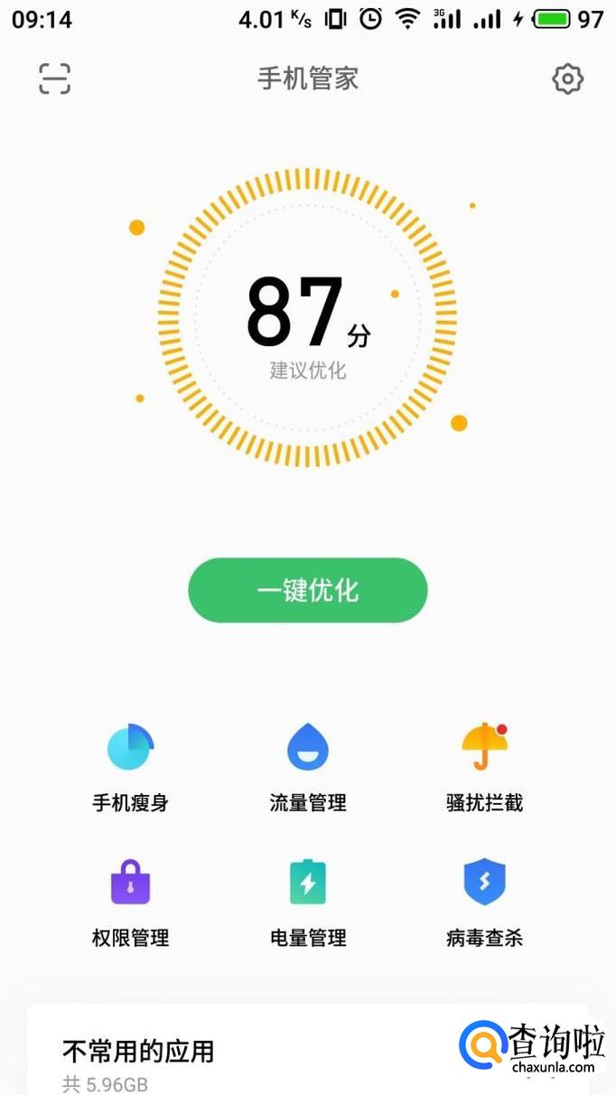 进入手机管家界面,系统会自动为系统状态评分,点击“一键优化”