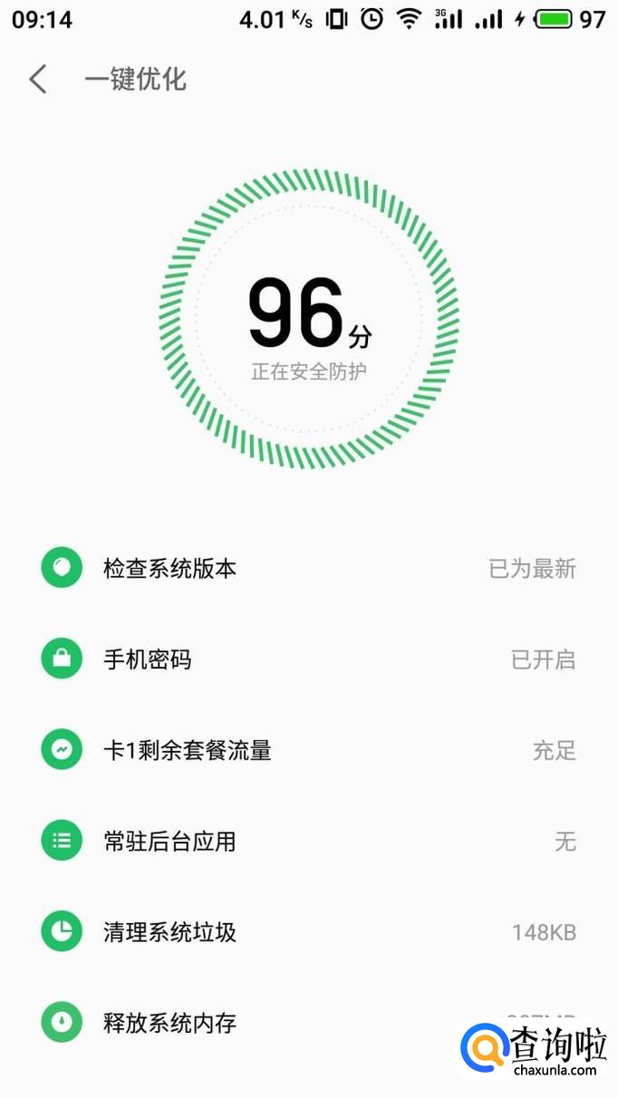 进入一键优化界面,即可自动为手机进行初级优化,释放运存。