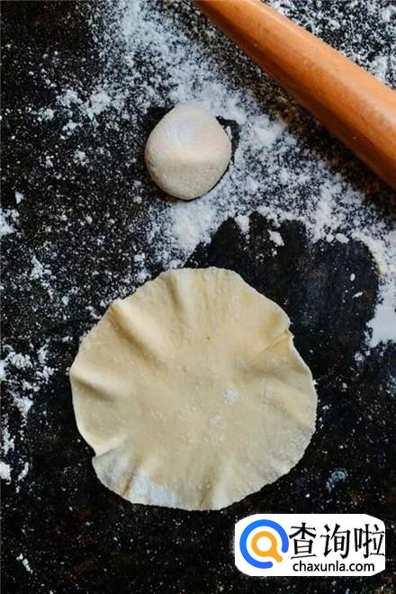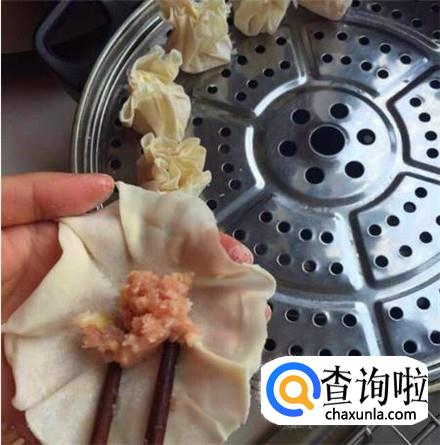 一点牛肉馅放进一张面皮里,从下到上捏紧,顶部做成一个荷叶边的样子,锅里烧开水放上笼屉蒸熟。