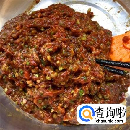 选择没有肥肉和筋的牛肉,用刀细细的剁成肉末,用筷子一边搅拌一边加水,一定要顺时针搅拌。