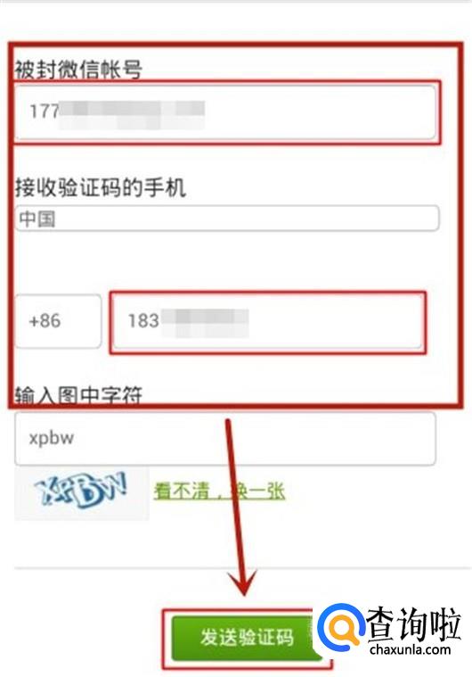 接着输入你的微信账号、手机号码和字符并点击发送验证码,如下图所示。