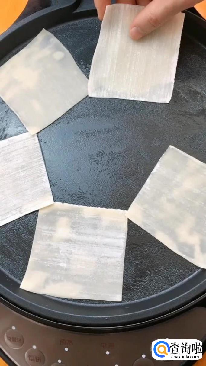 首先,在披萨锅上抹上一层油并铺上馄钝皮,如下图所示。小贴士:1.馄饨皮可以多买一些,做成馄饨配着馄饨披萨吃,味道更好;2.大家在平铺披萨皮的时候一定要注意间隔,不然很容易让混沌皮粘在一起的。