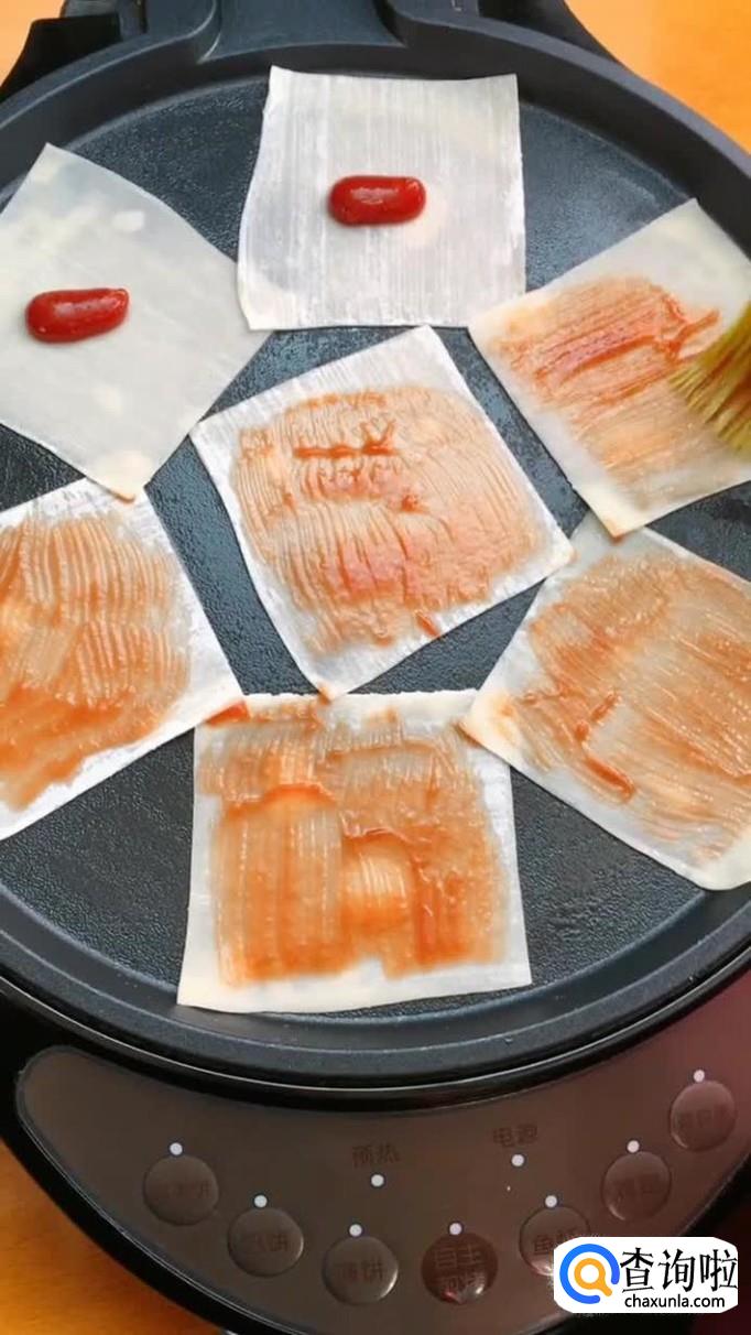 接着在馄饨皮的表面用刷子刷上一层番茄酱,如下图所示。小贴士:大家在刷番茄酱的时候一定要注意均匀,千万别涂太多了。