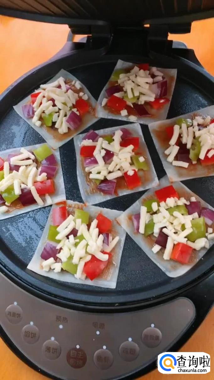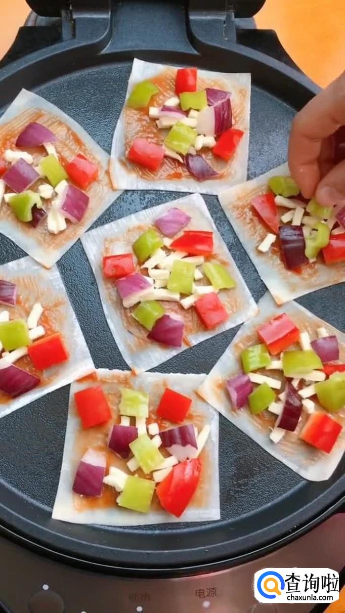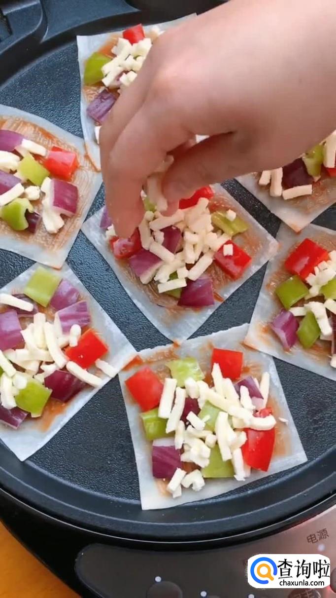 食材:馄饨皮,番茄酱,芝士,各色甜椒。