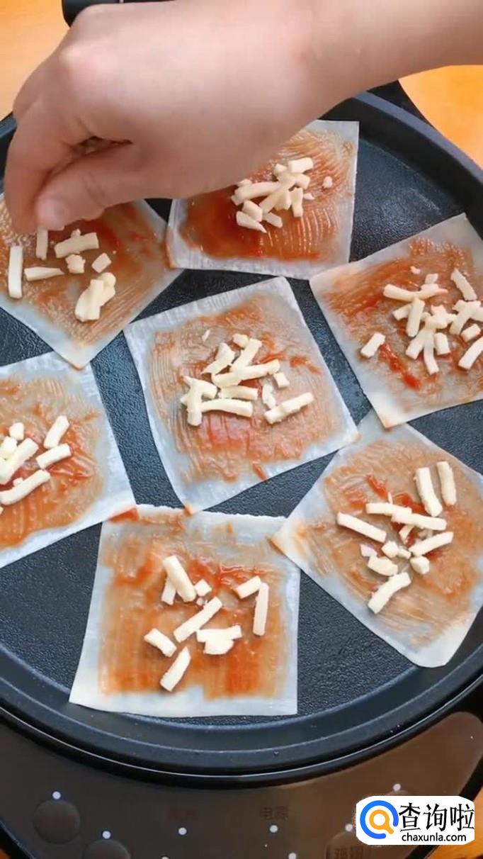 然后在馄饨皮的表面撒上一层芝士碎,如下图所示。小贴士:关于芝士的用量,小编建议大家根据自己的口味来决定就可以了。