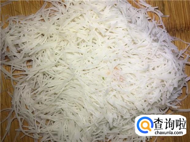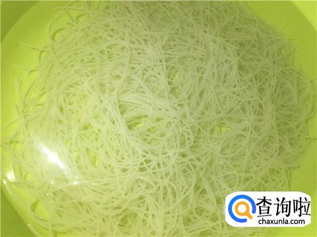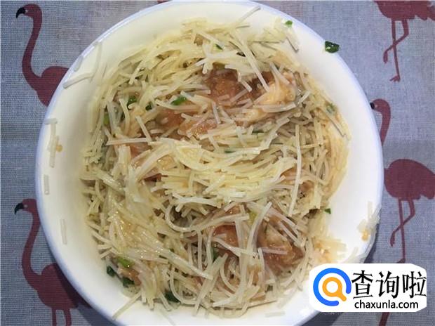 然后再把切碎的粉丝放入碗中,搅拌均匀。