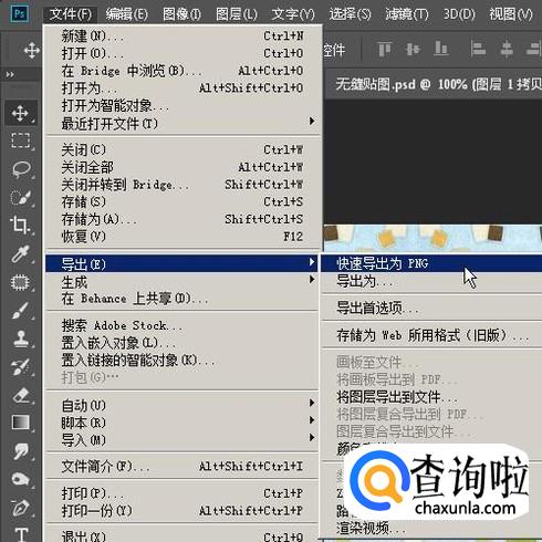 鼠标移到文件菜单,弹出下拉菜单点导出,再点:快速导出为PNG