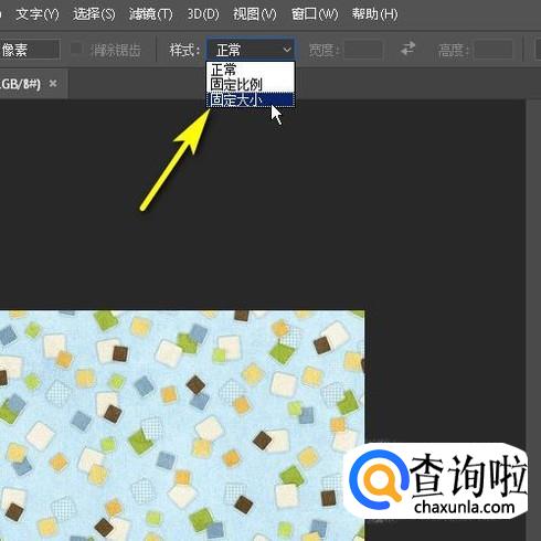 按M键,调出矩形框选工具。鼠标移到上面的属性栏中,点击样式的下拉按钮,从弹出的下拉菜单中选择:固定大小