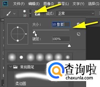 按B键,调出画笔工具,再在属性栏点击画笔大小的下拉按钮,设置画笔的大小数值。画笔的大小决定直线的粗细。