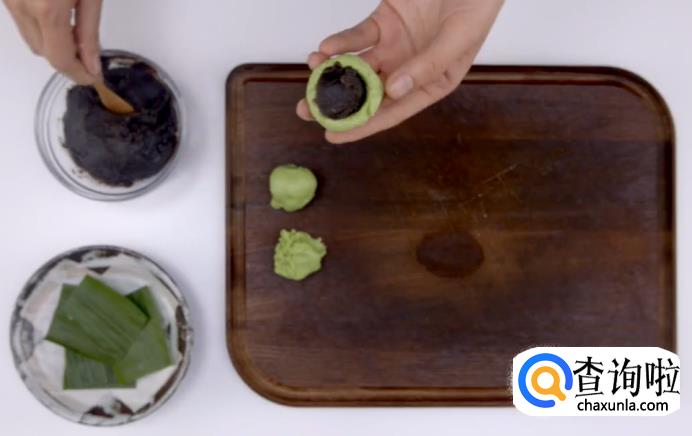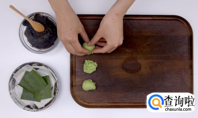 艾草 150克、糯米粉 200克、澄粉 50克、猪油 10克、白砂糖 5克、豆沙馅 50克、粽叶