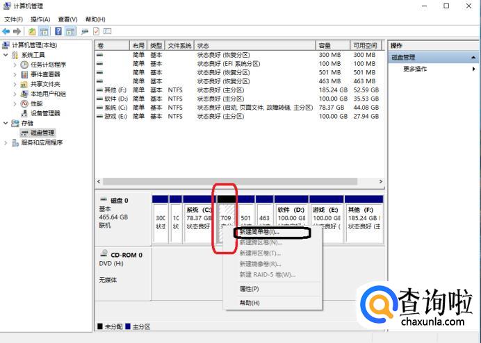 压缩成功后,回到上个页面,可以看到多了个新分区,右击它,然后点击“新建简单卷”。