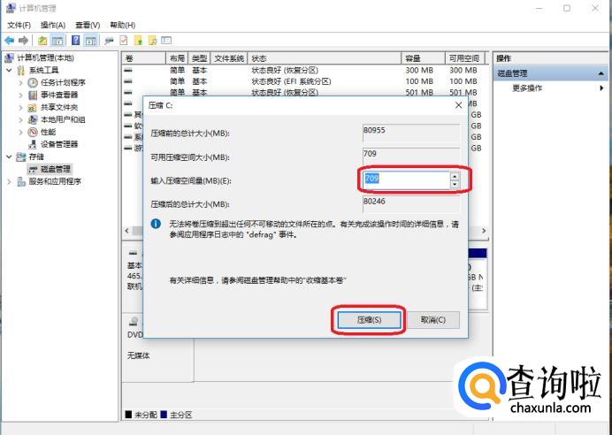 根据自己所要分的新分区大小,向输入压缩空间量填入相应的数字,然后点击“压缩”。
