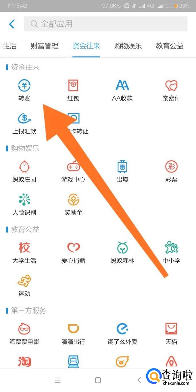 然后找到“资金来往”页面下的“转账”,点击进入。